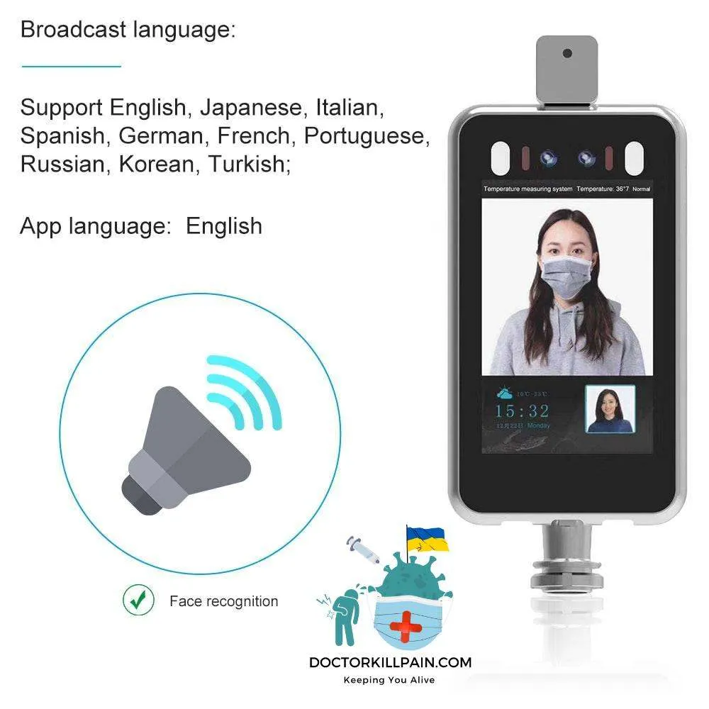 - Support electronic voice broadcast (average human body temperature or super high alarm, face recognition verification results)